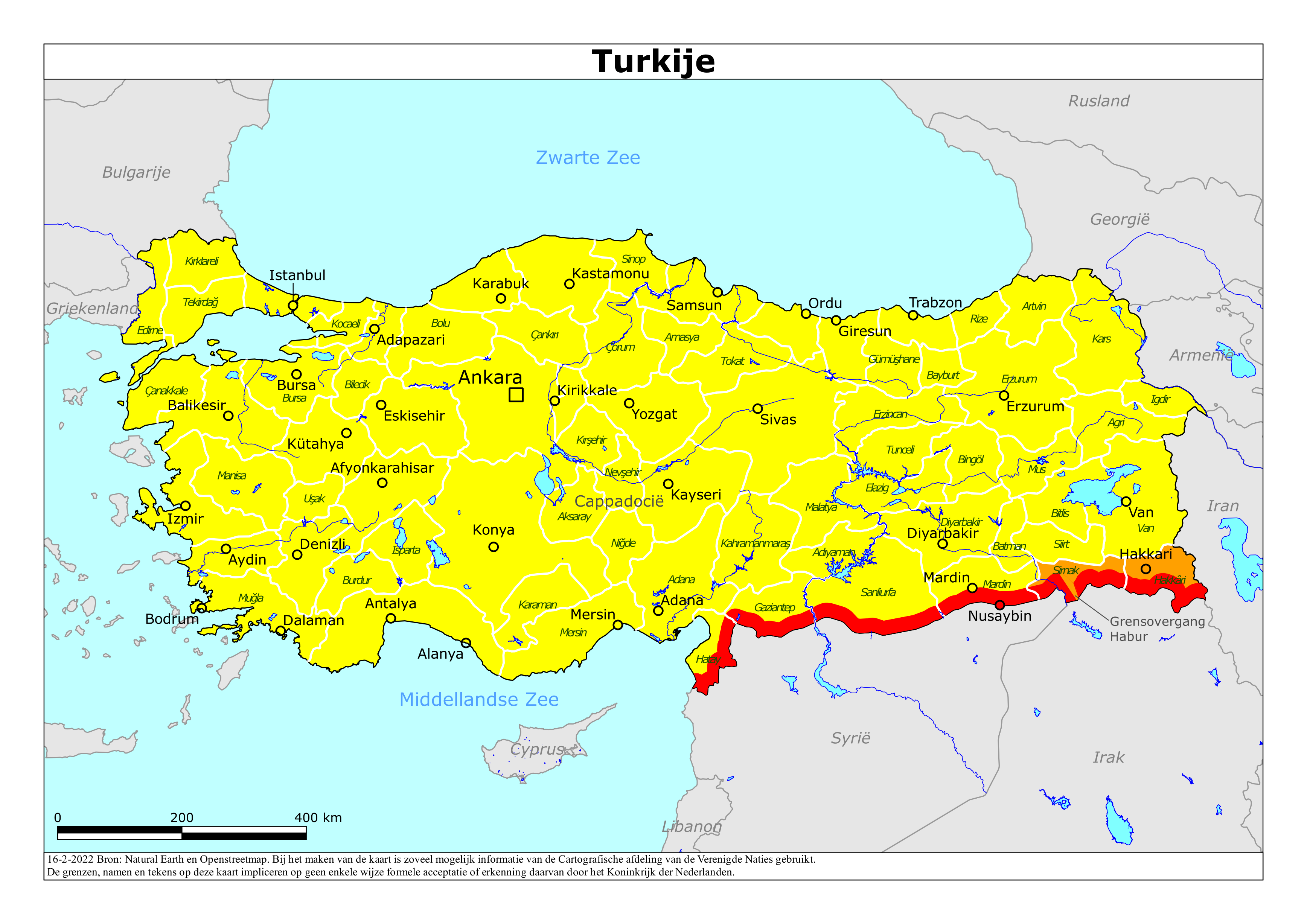 Het reisadvies voor Turkije is voor het grootste deel positief. De noodtoestand die in februari werd uitgeroepen vanwege de hevige aardbevingen is opgeheven. Wel zijn er in heel Turkije meer veiligheidsrisico’s dan in Nederland en België. Er geldt een negatief reisadvies voor de grens met Syrië en Irak. Kom absoluut niet binnen een straal van 10 km van de grens met Syrië of Irak. Hier zijn militairen actief die met geweld optreden. Reis alleen voor noodzakelijk reizen naar de provincies Sirnak of Hakkari, of de Turks-Iraakse grenseovergang bij Habur. Ondanks de explosie die op 13 november 2022 in Istanbul plaatsvond en het feit dat hier enkele doden en gewonden bij vielen, geldt voor deze stad een geel reisadvies.